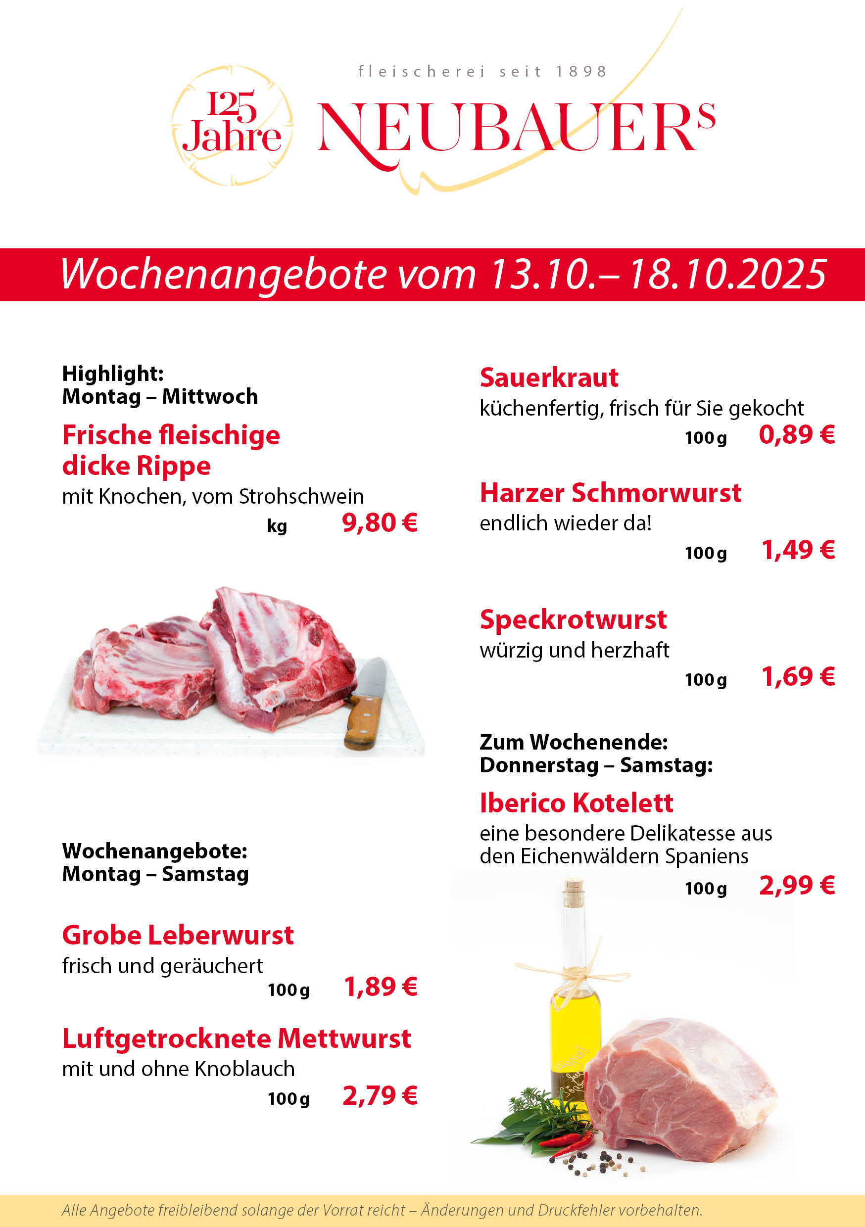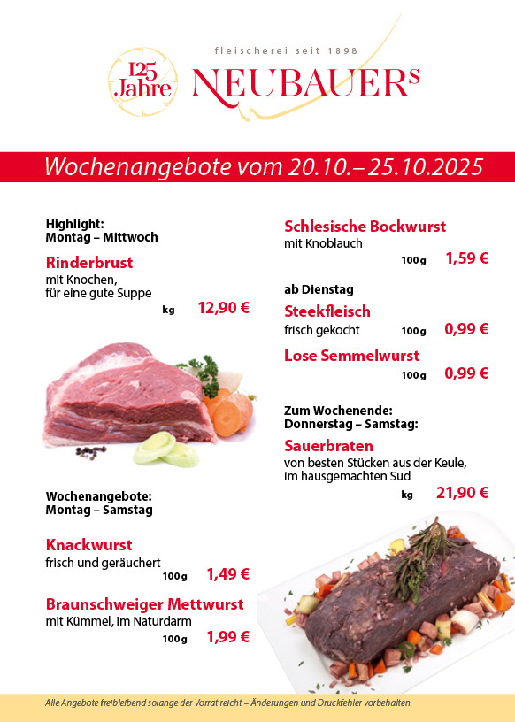 Kennen Sie bereits die Vielfalt unserer Angebote? Neben traditionsreichen Wurstspezialitäten und hochwertigem Qualitätsfleisch gehören küchenfertige Fleischgerichte ebenso zu unserer Angebotspalette wie hausgemachte Salatkreationen und eine reichhaltige Käseauswahl. Wir laden Sie herzlich ein, die Qualität und geschmackliche Vielfalt unserer Produkte zu probieren. Unser Fleischermeister stellt daher eine wöchentlich wechselnde Auswahl an Vorteilsangeboten für Sie zusammen.